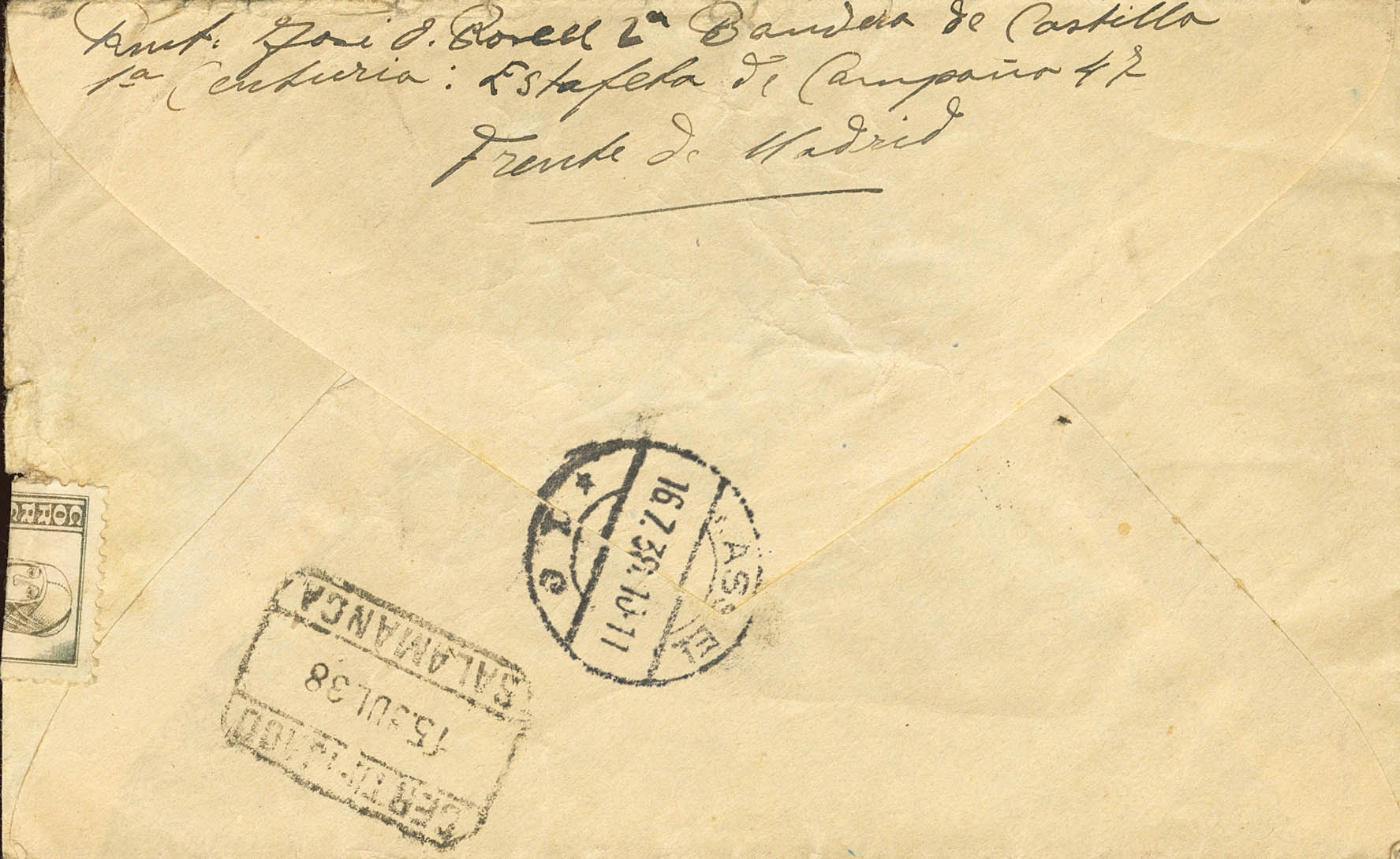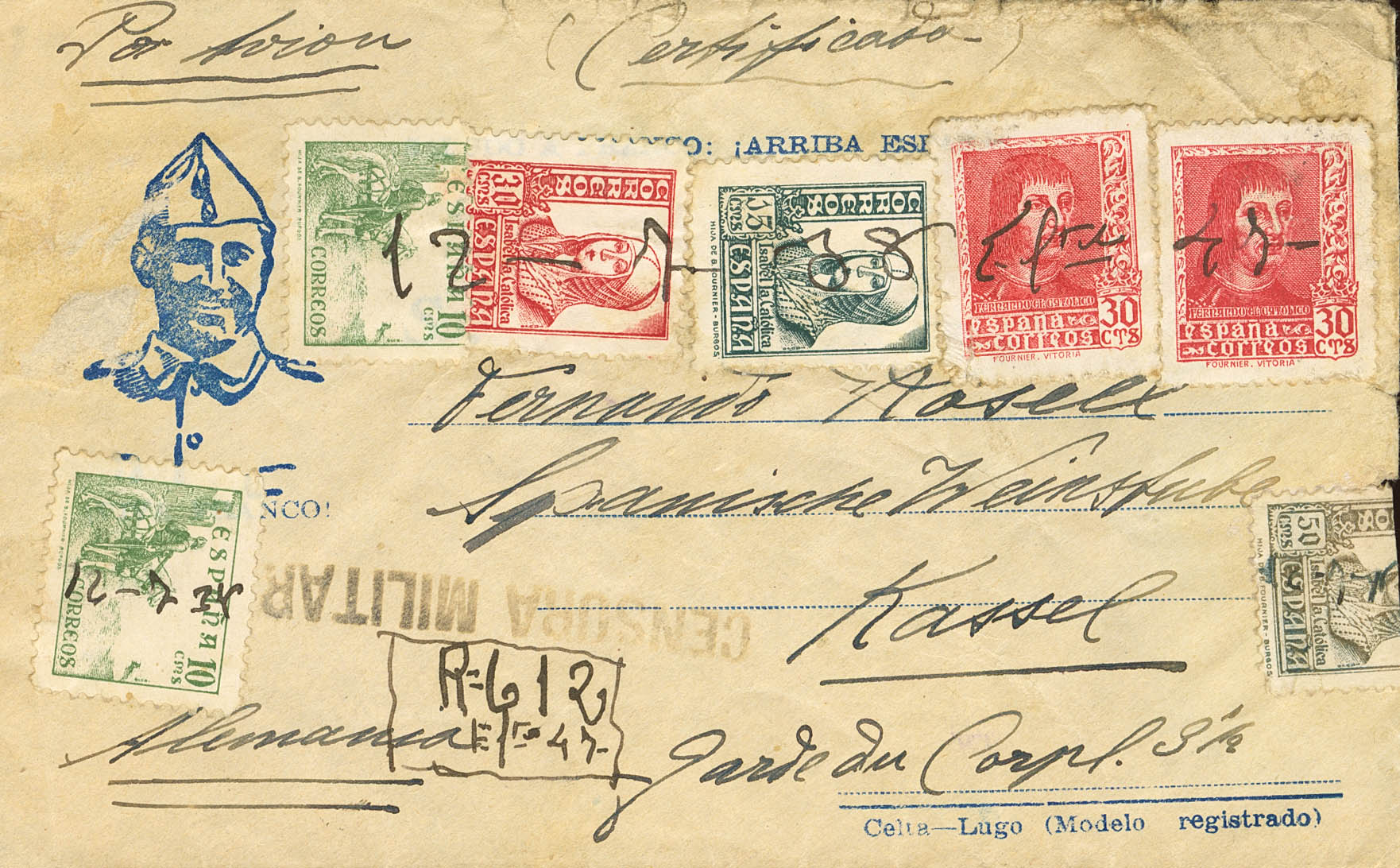 English |ENVELOPE| 844(2), 817(2), 820. 1938. 30 cts red, two stamps and various values. Certified from "the front" of MADRID to KASSEL (GERMANY). Stamps cancelled by hand with the date and arrival on the back. MAGNIFICENT.
