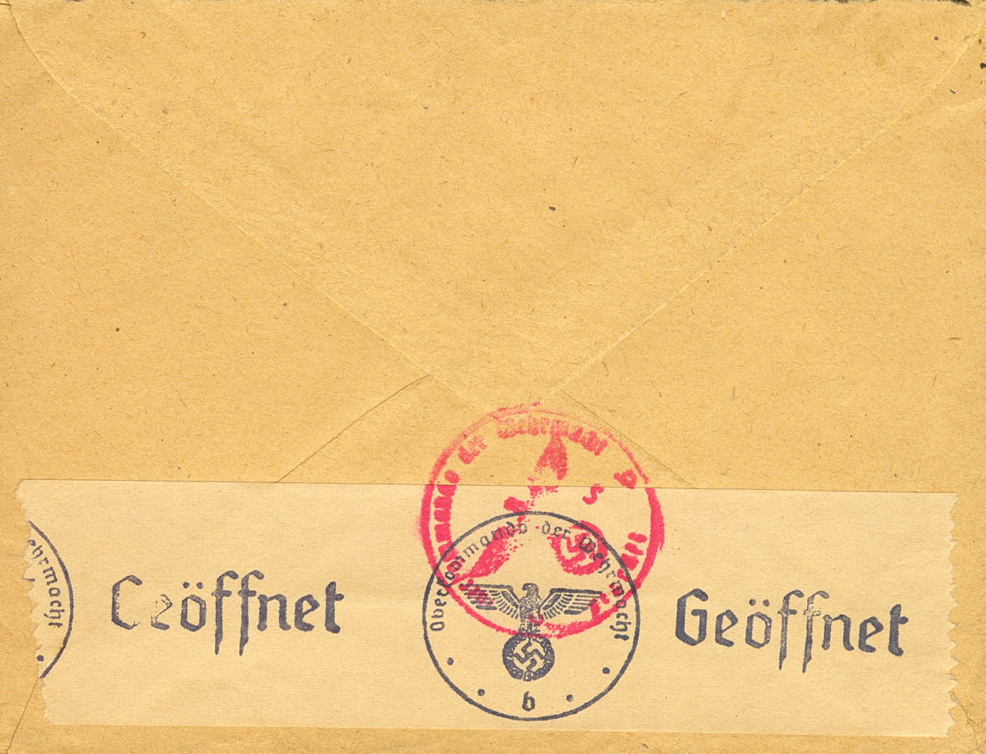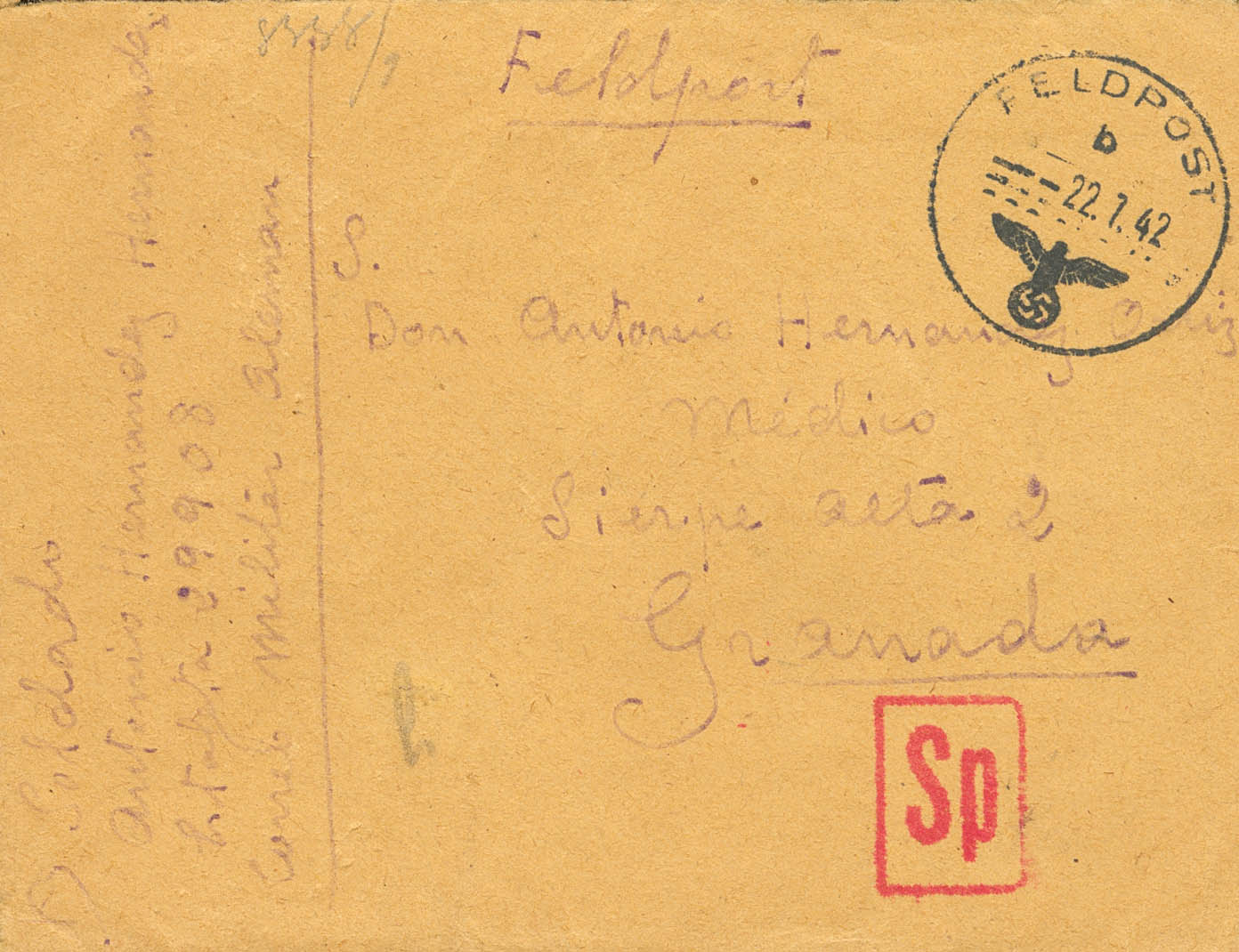 1942. (22 Julio). Feldpost Nº29908 (Grupo de Transmisiones, Compañía de Teléfonos) a GRANADA. Fechador FELDPOST / B y marca S.P., en rojo (pequeña). MAGNIFICA.