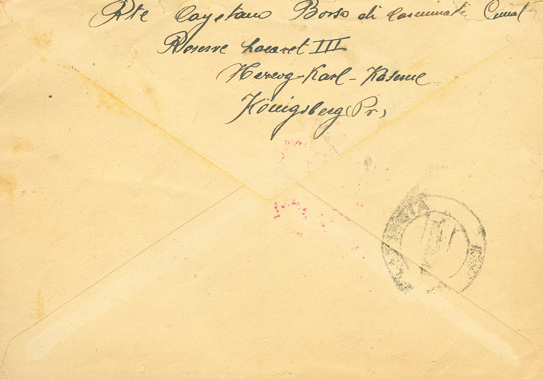 (1942ca). Sellos alemanes de 10 p castaño y 25 p ultramar (sin matasellar). KONIGSBERG (ALEMANIA) a VALENCIA, remitida desde el hospital militar de Konigsberg. En el frente marcas S.P., en rojo (grande), Ab, en azul y MIT LUFTPOST / PAR AVION, en violeta y al dorso llegada. BONITA.