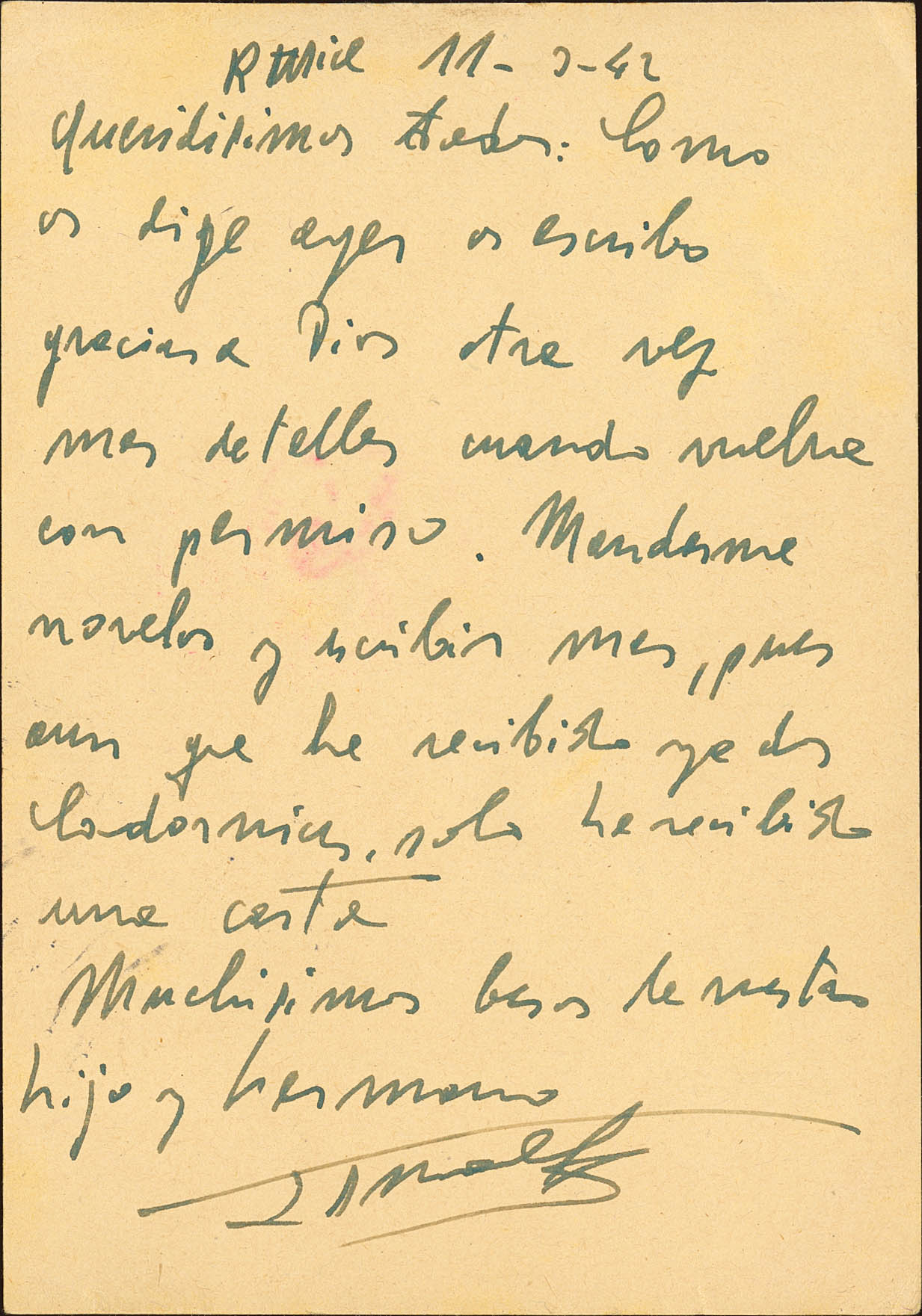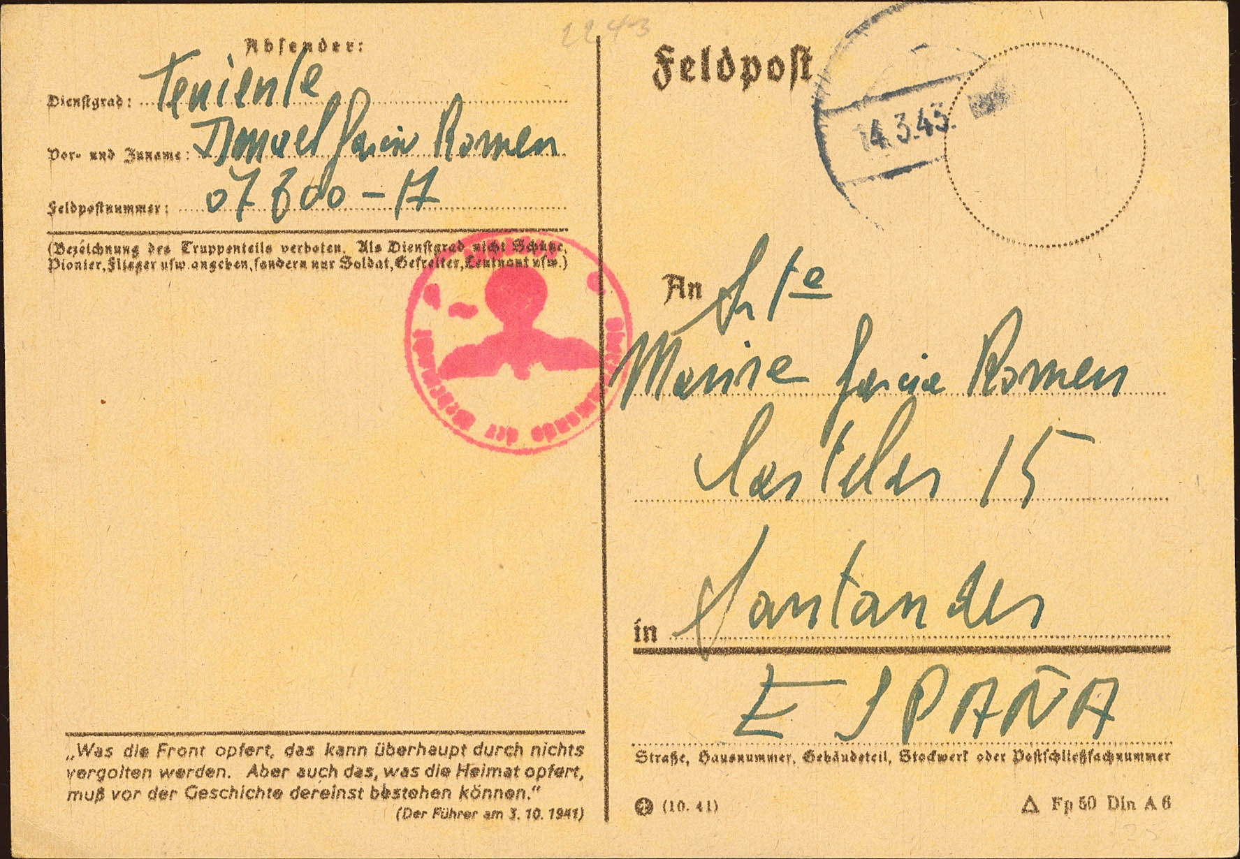 1943. (March 11). Postcard from Feldpost Nº07800A (Infantry Regiment 262 PM1º BON) to SANTANDER, sent from the Krasnybor area during the attack of the Soviet army. Censor mark, in red. MAGNIFICENT.