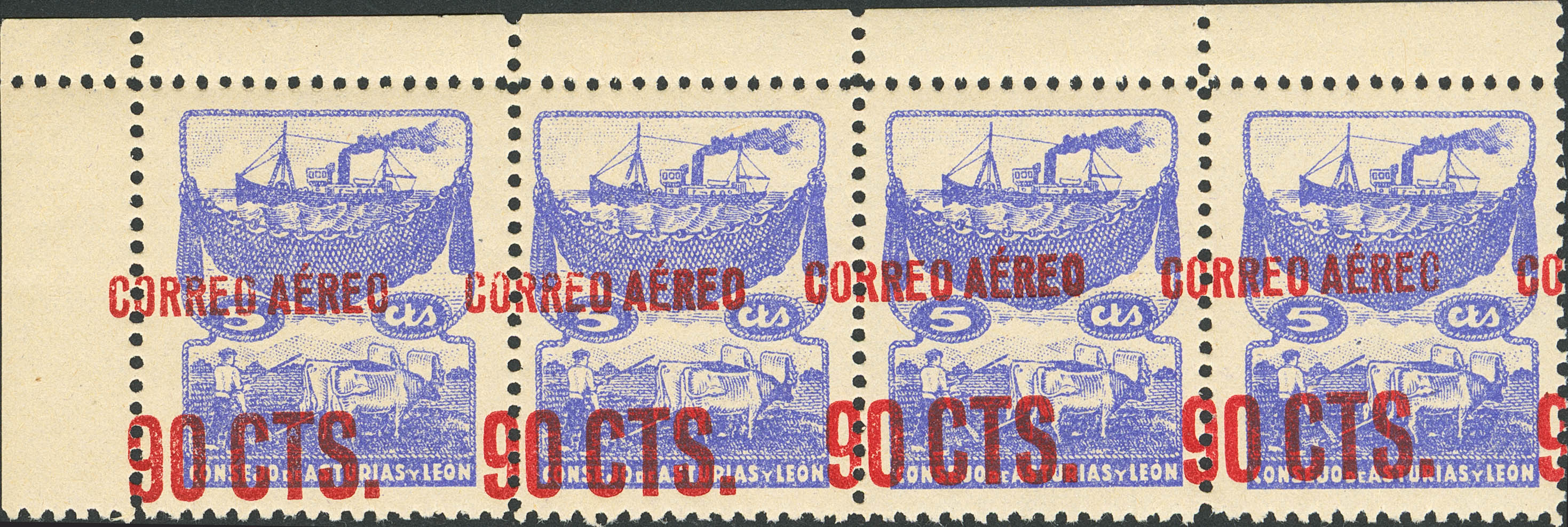 ★★ NE13hdh(4). 1937. 90 cts sobre 5 cts azul, tira de cuatro y esquina de pliego. HABILITACION DESPLAZADA HORIZONTALMENTE. MAGNIFICA Y ESPECTACULAR. Edifil 2017: +++168 Euros