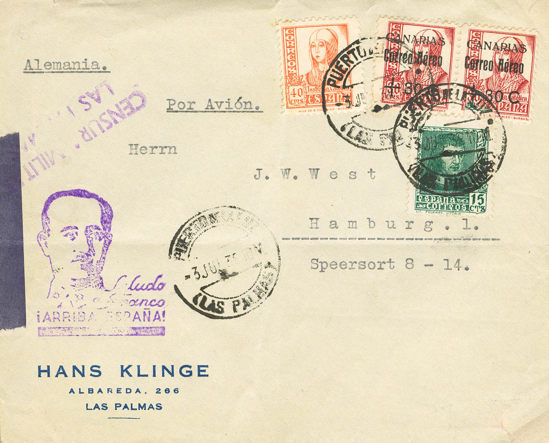 40(2). 1938. 30 cts sobre 30 cts rojo, pareja, 15 cts verde y 40 cts naranja. PUERTO DE LA LUZ a HAMBURGO. MAGNIFICA.