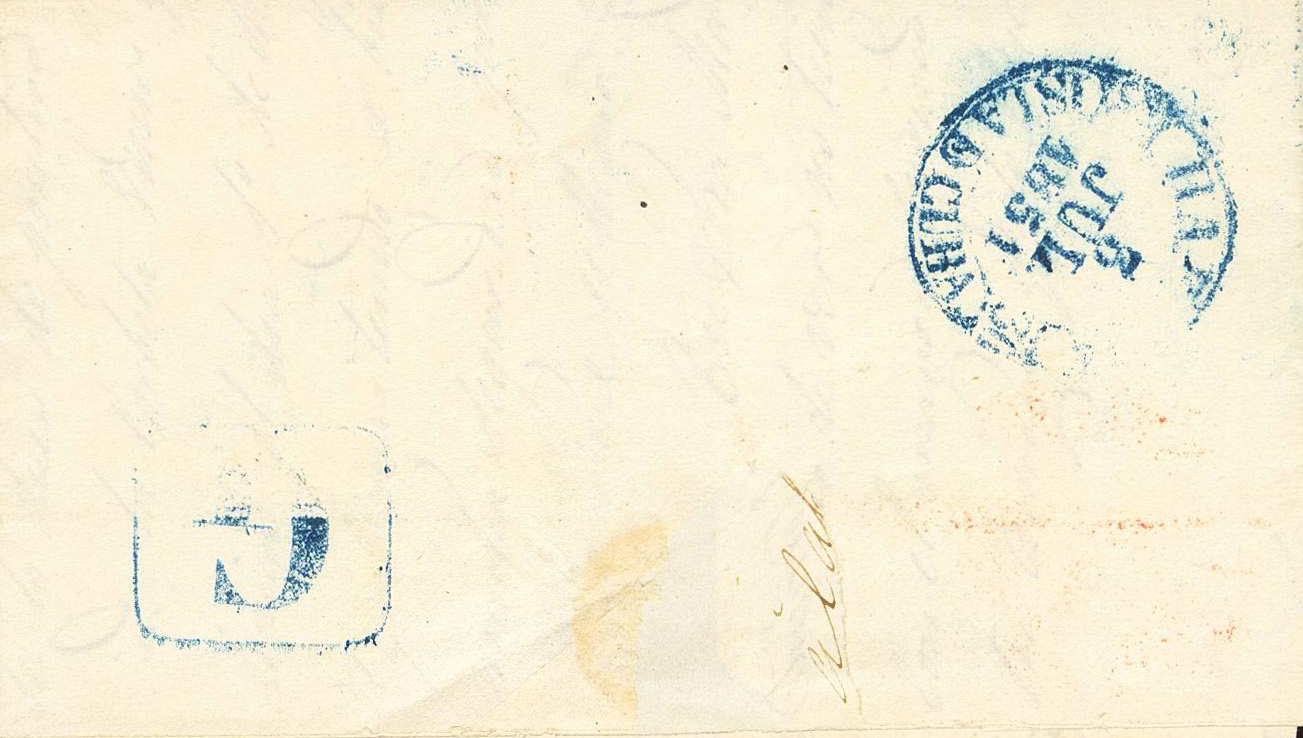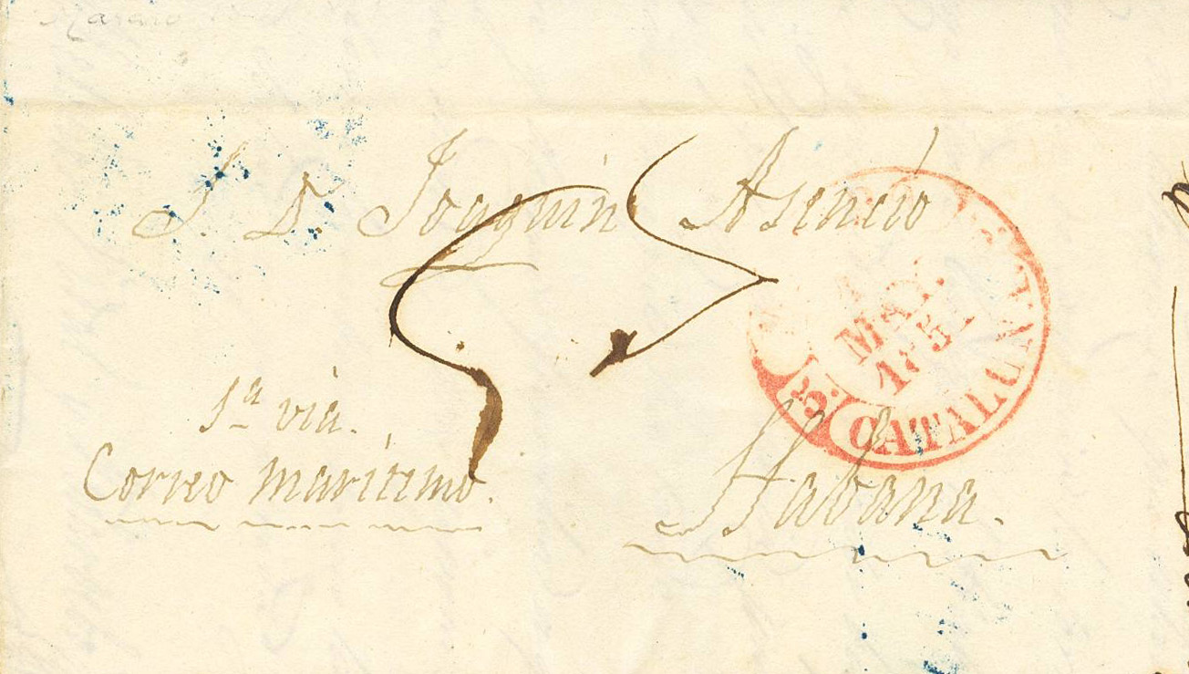 1851. MATARO (BARCELONA) a LA HABANA. Baeza MATARO / CATALUÑA y manuscrito "1ª Vía Correo Marítimo", al dorso marca "G", en azul aplicada en destino en el último año de concesión de la Empresa de los Correos Marítimos de La Habana (P.E.70) edición 2004. MAGNIFICA Y EXTRAORDINARIAMENTE RARA.
