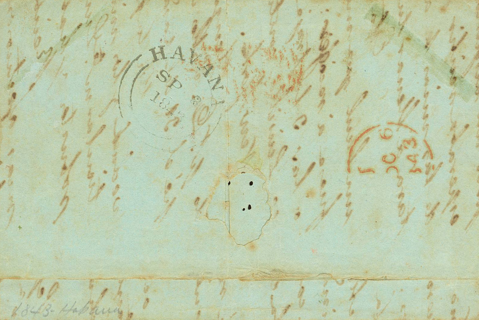 1843. HAVANA to PARIS (FRANCE), circulated via London. On the front, Franco-British exchange mark COLONIES / C.ART.12, in red and on the back HAVANA, in black, from the British Postal Agency (PE73) 2004 edition. MAGNIFICENT AND RARE.