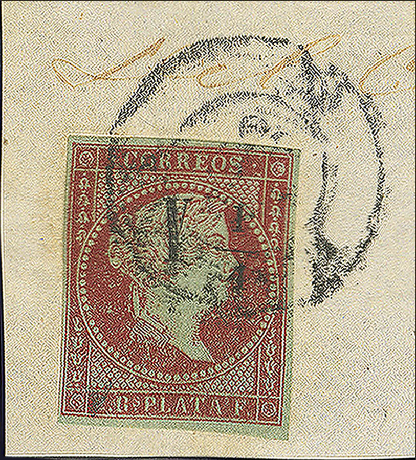 |fragment| 4. 1855. Y¼ on 2 reales carmine (Type I), on fragment. Postmark LA HABANA / *. MAGNIFICENT AND RARE. Cert. ECHENAGUSIA.