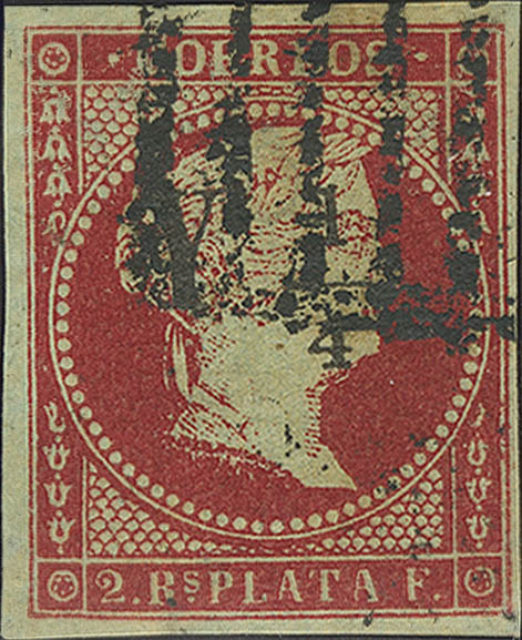 (★) 5. 1855. Y¼ sobre 2 reales rojo. Matasello PARRILLA DE LINEAS, utilizada para periódicos. MAGNIFICO Y MUY RARO. Cert. ECHENAGUSIA