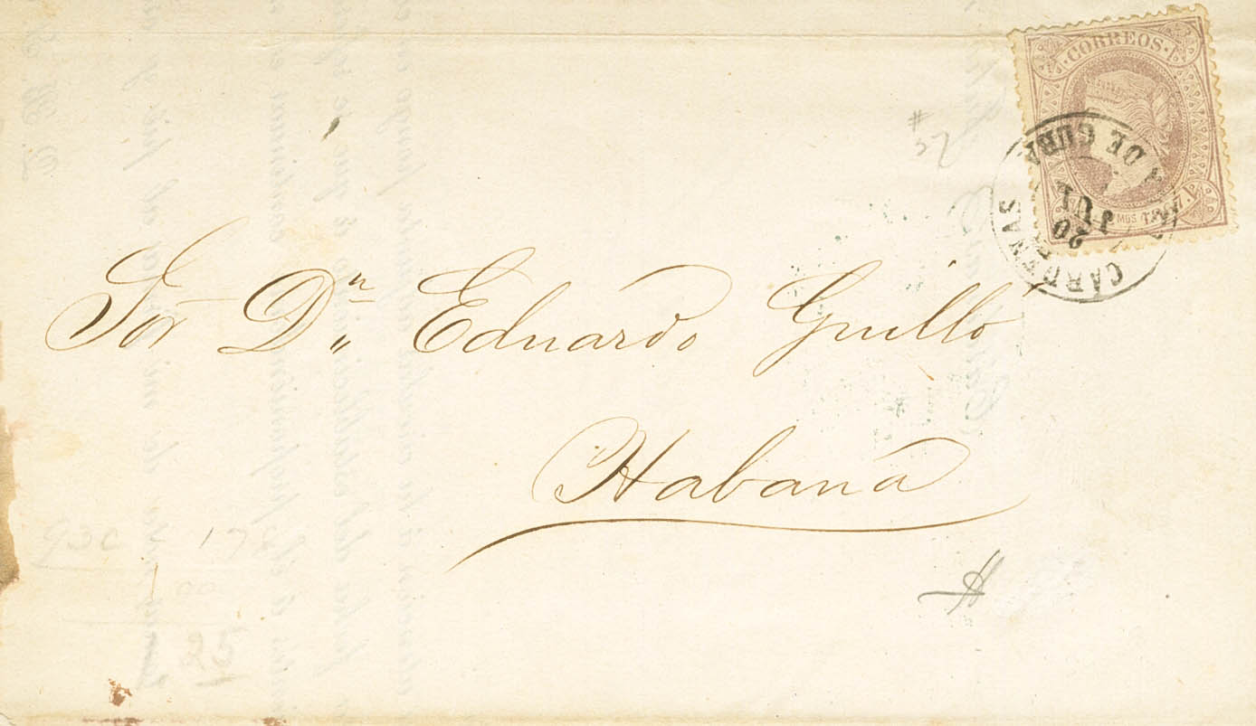 18. 1867. 5 cts lila. Impreso de CARDENAS a LA HABANA. Matasello CARDENAS / ISLA DE CUBA. MAGNIFICA Y MUY RARA.