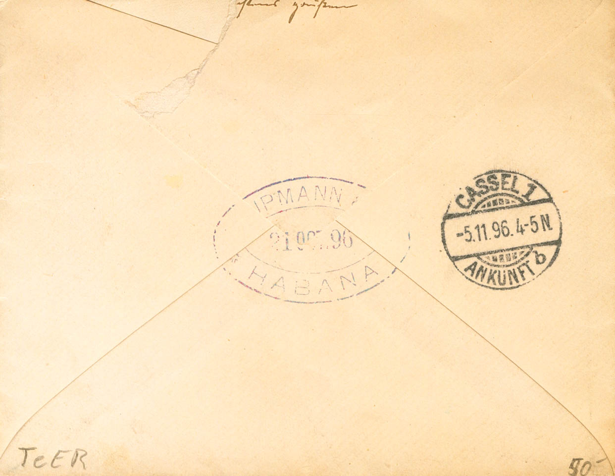 150(2). 1896. 10 cts verde azul, pareja (un sello con fallo de impresión en la cara). LA HABANA a CASSEL (ALEMANIA). En el frente manuscrito y estampado VIA TAMPA, en azul. MAGNIFICA.