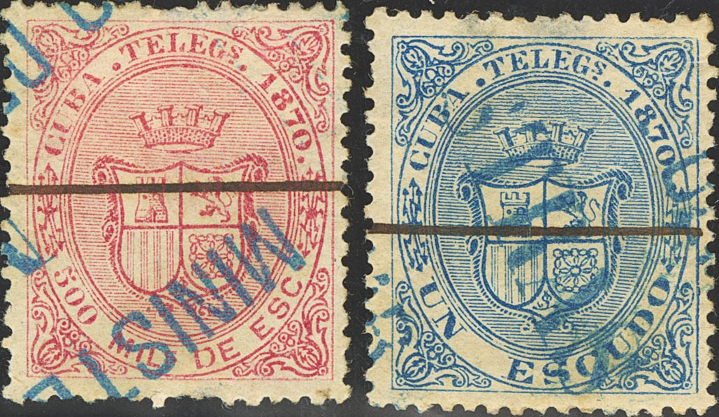 8M, 9M. 1870. 500 mils pink and 1 blue shield. Overprint MINISTRY OF OVERSEAS / SAMPLES, in blue and INK STRIPE. MAGNIFICENT AND VERY RARE, THE 1 SHIELD IS NOT LISTED AND THE 500 MILS IS MENTIONED IN THE CATALOG, BUT WITHOUT PRICE.