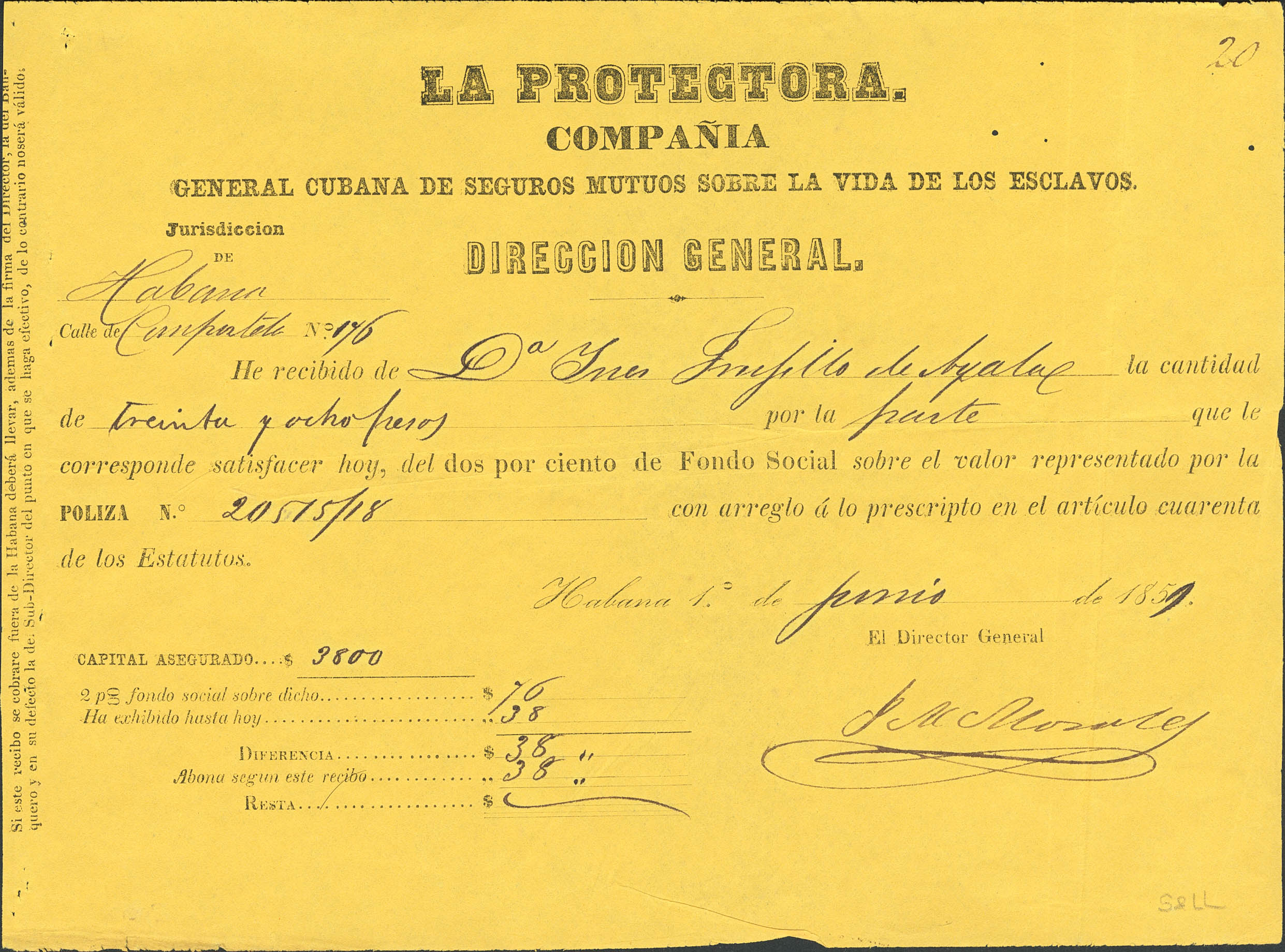 1859. Set of three slave insurance documents dated in Havana in 1859 and 1860 from different insurance companies. MAGNIFICENT AND UNUSUAL.