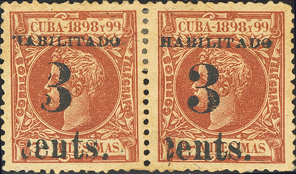 ★ 3(2). 1898. 3 ctvos sobre 3 mils castaño rojo, pareja. 1ª tirada, posición 3 dos veces consecutivas. MAGNIFICA Y EXTRAORDINARIAMENTE RARA, SEGUN EL EXPERTO CARLOS ECHENAGUSIA ESTE ERROR PUEDE TRATARSE DE UNA PRUEBA PREVIA A LA IMPRESION DEFINITIVA, ASEGURA QUE LA TINTA Y LA TIPOGRAFIA DE LA SOBRECARGA SON ORIGINALES, SE TRATA SIN DUDA DE UNA PIEZA INEDITA, IDEAL PARA EL ESPECIALISTA DE PUERTO PRINCIPE POR SU ENORME ESPECTACULARIDAD. Cert. ECHENAGUSIA.