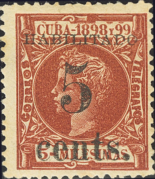 (★) 4. 1898. 5 ctvos sobre 5 mils castaño rojo. 1ª tirada, posición 5. MAGNIFICO Y RARO. Cert. ECHENAGUSIA.