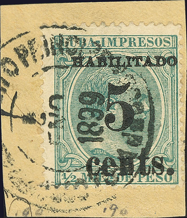 |fragment| 5. 1899. 5 cents on ½ mils blue, on fragment. 2nd issue, position 3. MAGNIFICENT. Cert. ECHENAGUSIA.