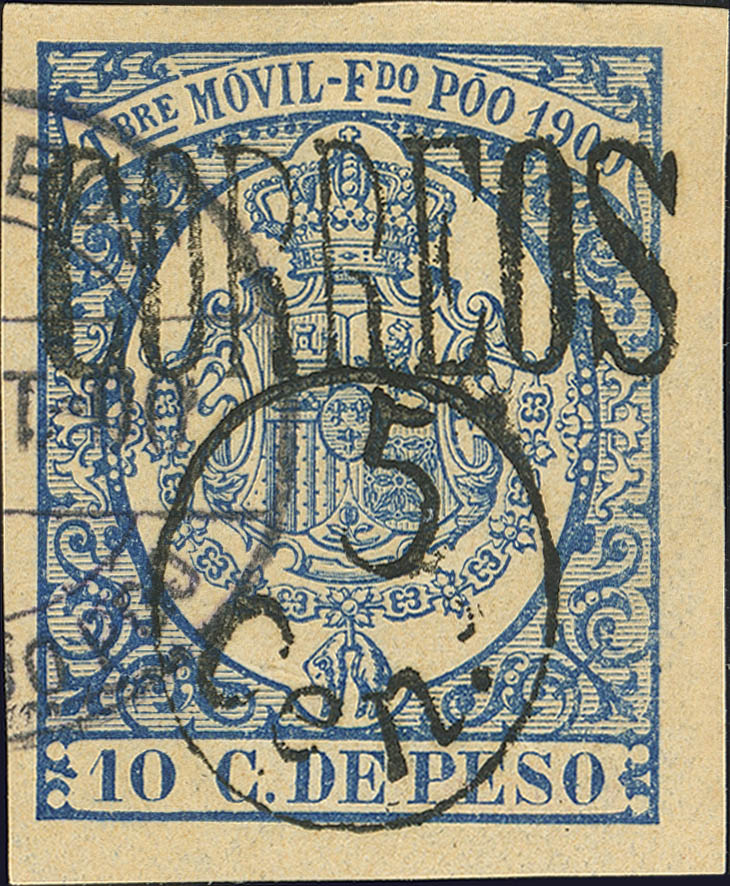 48A. 1900. 5 cts sobre de 10 cts azul. Sobrecarga en negro. MAGNIFICO. Edifil 2018: 51 Euros