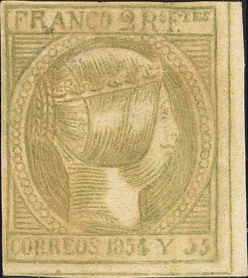 English (★) 4. 1854. 2 reales green, leaf edge (light dot). MAGNIFICENT AND RARE IN NEW. Cert. CEM. Edifil 2024: +1,350 Euros