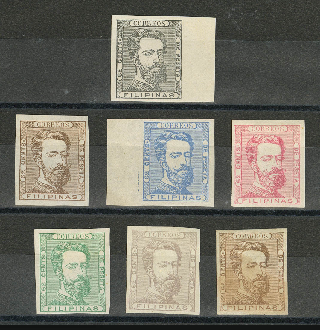(★) 28P(7). 1872. Set of seven COLOUR ESSAYS (imperforate) of 62 cts, in different colours. MAGNIFICENT AND RARE SET. Ex-Antonio Cuesta.