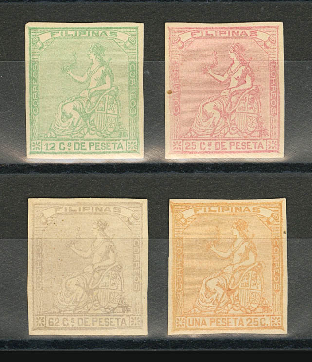 ★/(★) 30/33P. 1874. Complete series. COLOR ESSAYS (imperforate). MAGNIFICENT. Ex-Antonio Cuesta.