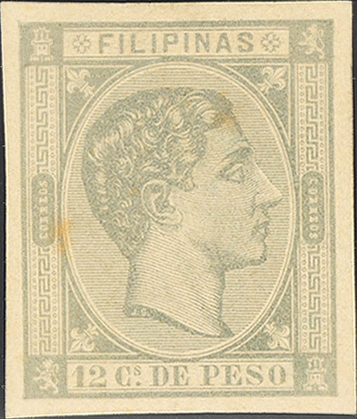 (★) 38P. 1876. 12 ctvos gris. PRUEBA DE PUNZON (márgenes pequeños). MAGNIFICA Y RARA. Ex-Antonio Cuesta.
