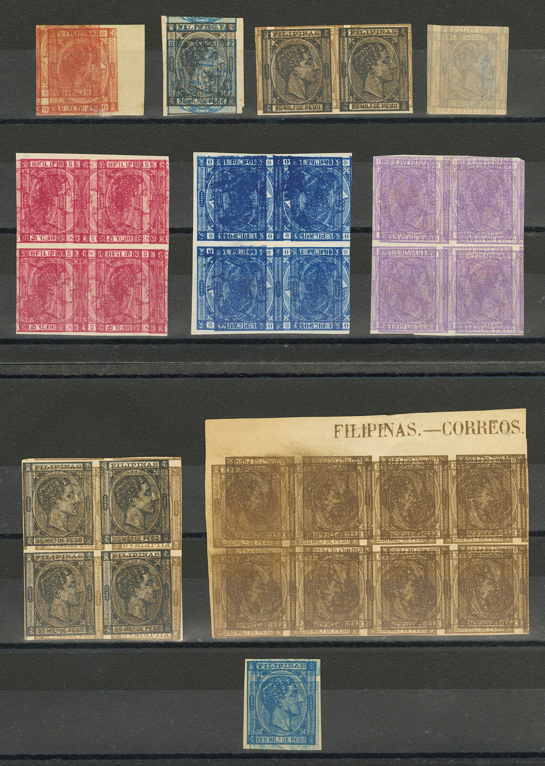 (★)1876. Interesante conjunto de maculaturas (sueltos y bloques) de las emisiones de Alfonso XII de 1876 y 1878. MAGNIFICO E INUSUAL CONJUNTO. Ex-Antonio Cuesta.
