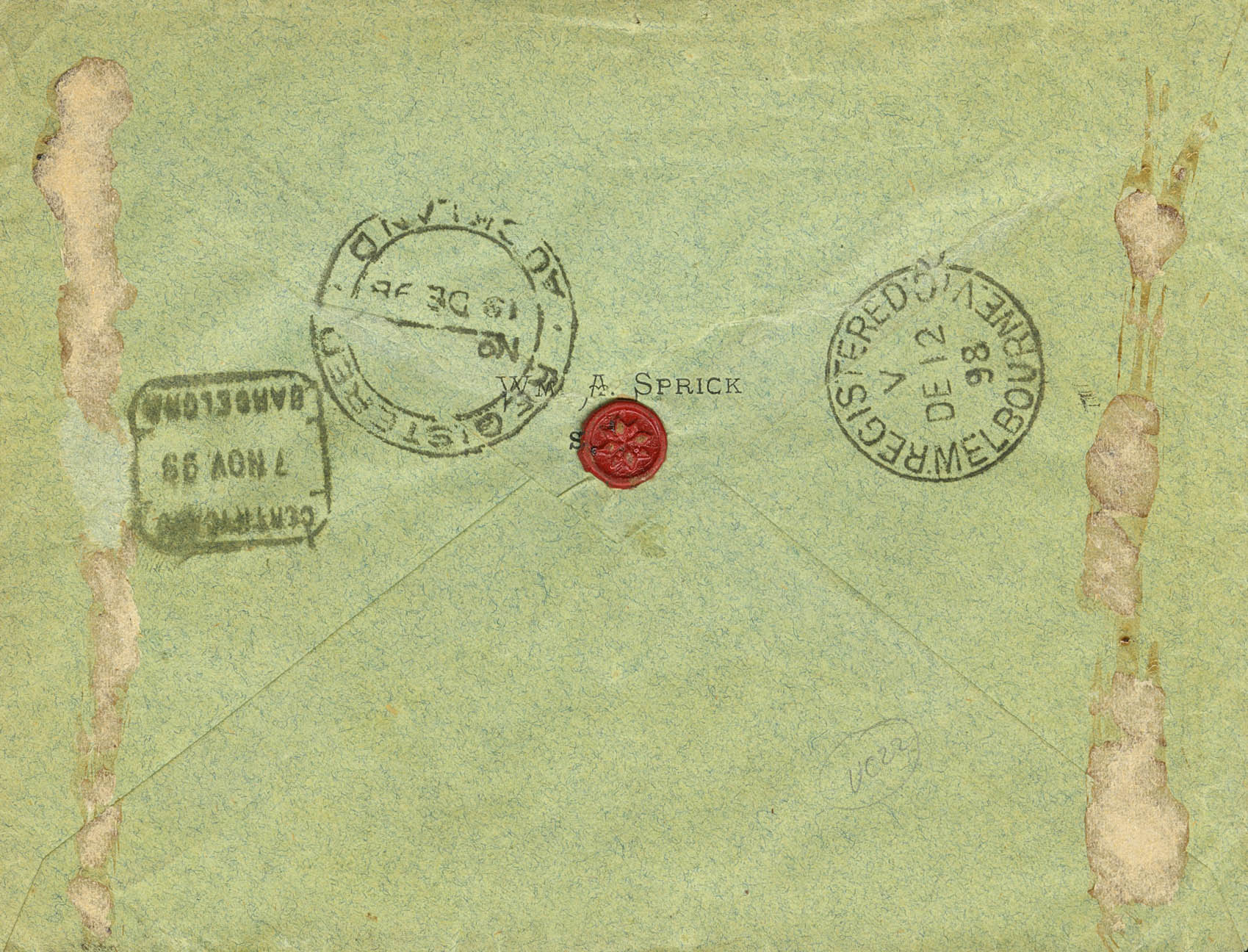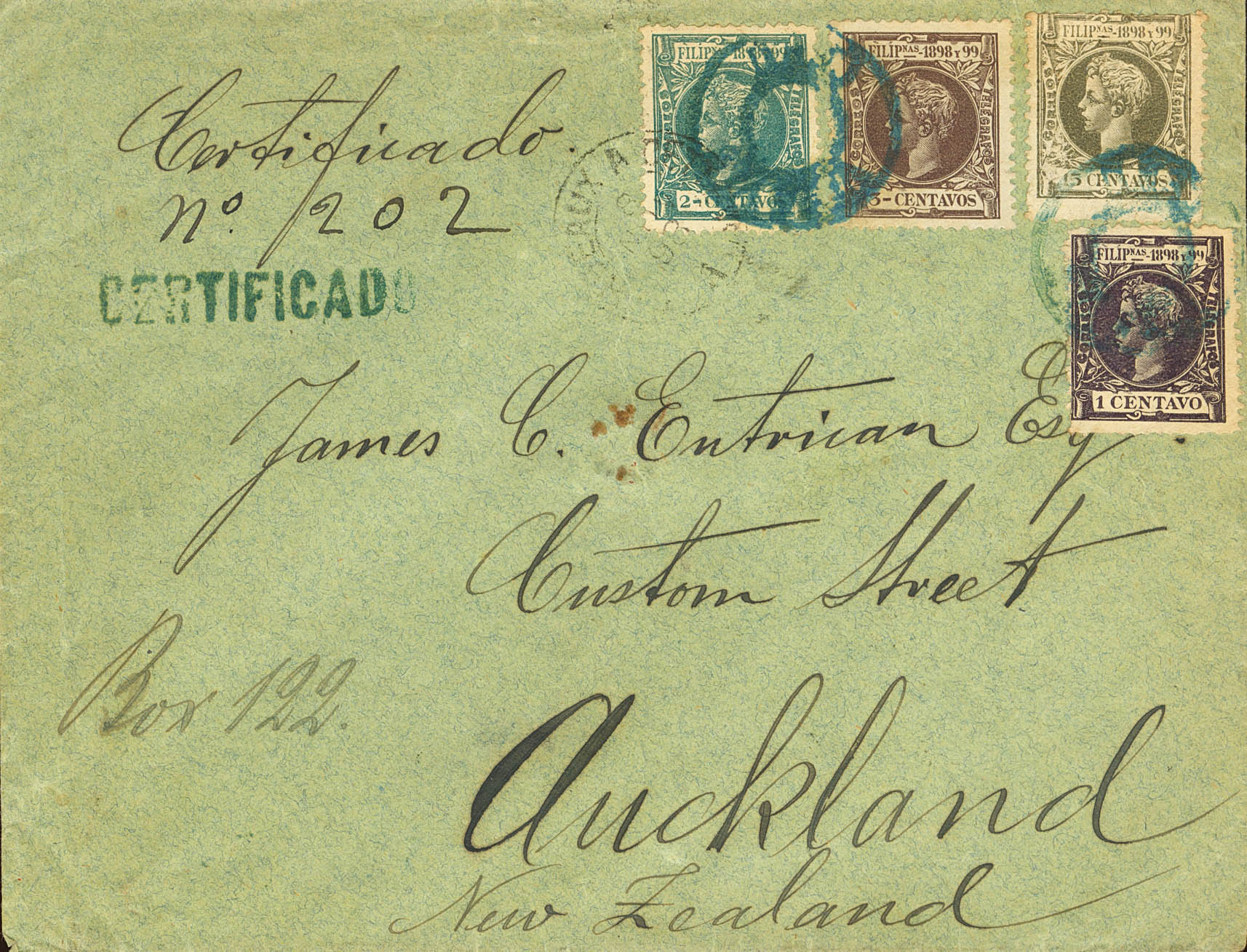 |ENVELOPE| 136, 137, 138, 144. 1898. 1 cent violet, 2 cents blue-green, 3 cents chestnut and 15 cents olive-grey. Certified from SAMAR to AUCKLAND (NEW ZEALAND), circulated via Spain, France and Australia. SAMAR postmark, in blue. MAGNIFICENT AND VERY RARE, WE ONLY KNOW OF TWO LETTERS FRANKED WITH ALFONSO XIII STAMPS ADDRESSED TO NEW ZEALAND.