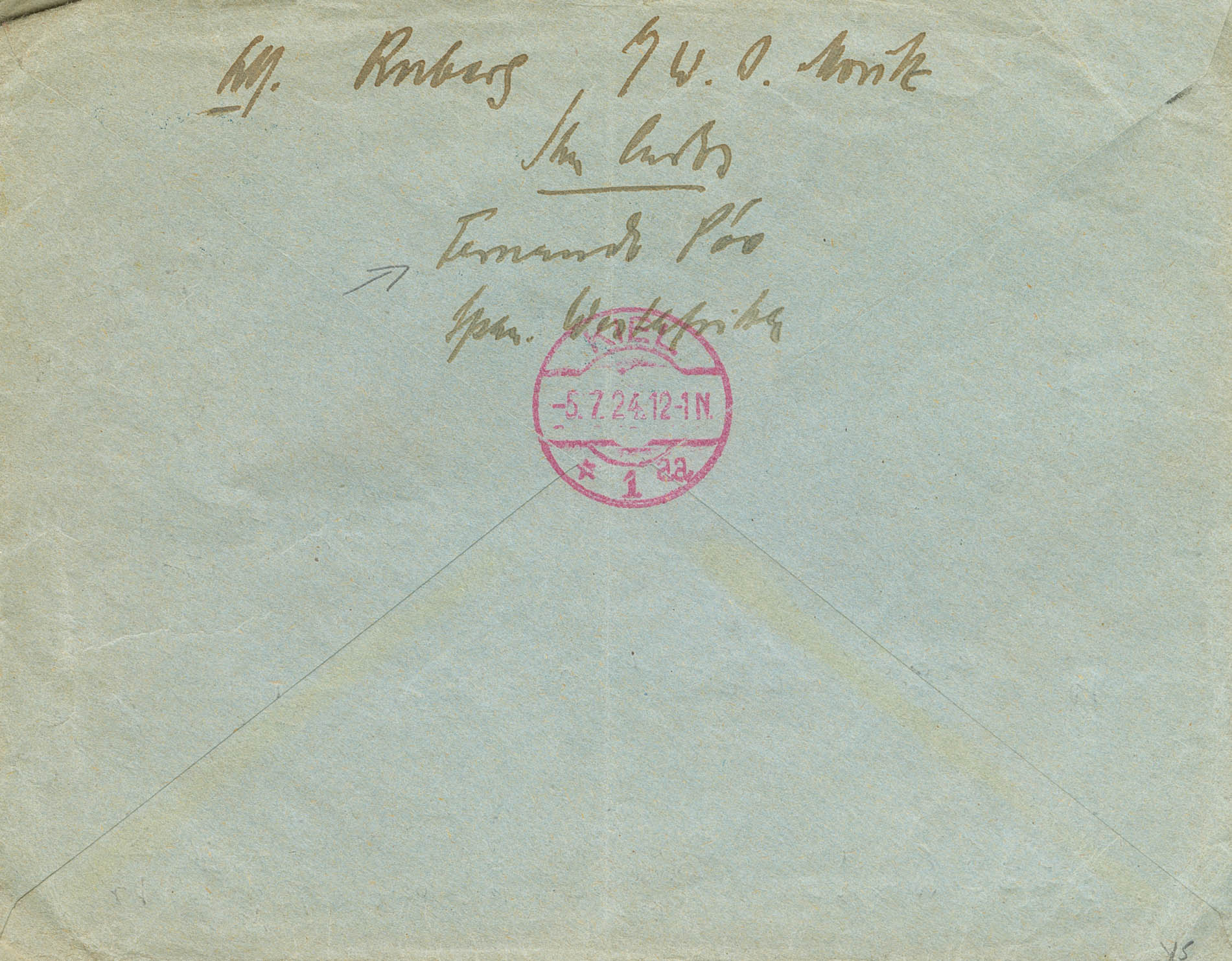 159(2). 1924. 20 cts lila, pareja. SANTA ISABEL a KIEL (ALEMANIA). Matasello SANTA ISABEL / (FERNANDO POO), en azul y al dorso llegada. MAGNIFICA.