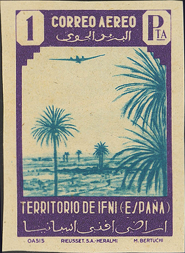 English (★) 31s. 1943. 1 pts violet and blue. IMPERFORATED and security mark on the back AGoodHIVO RIEUSSET SL SAMPLE. MAGNIFICENT. Edifil 2019: 48 Euros