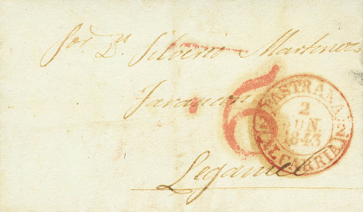 1843. PASTRANA to LEGANIEL (CUENCA). Baeza PASTRANA / 2-JUN-1843 / ALCARRIA. MAGNIFICENT AND VERY RARE, FIRST KNOWN DATE OF THE USE OF THE BAEZA IN THIS TOWN.