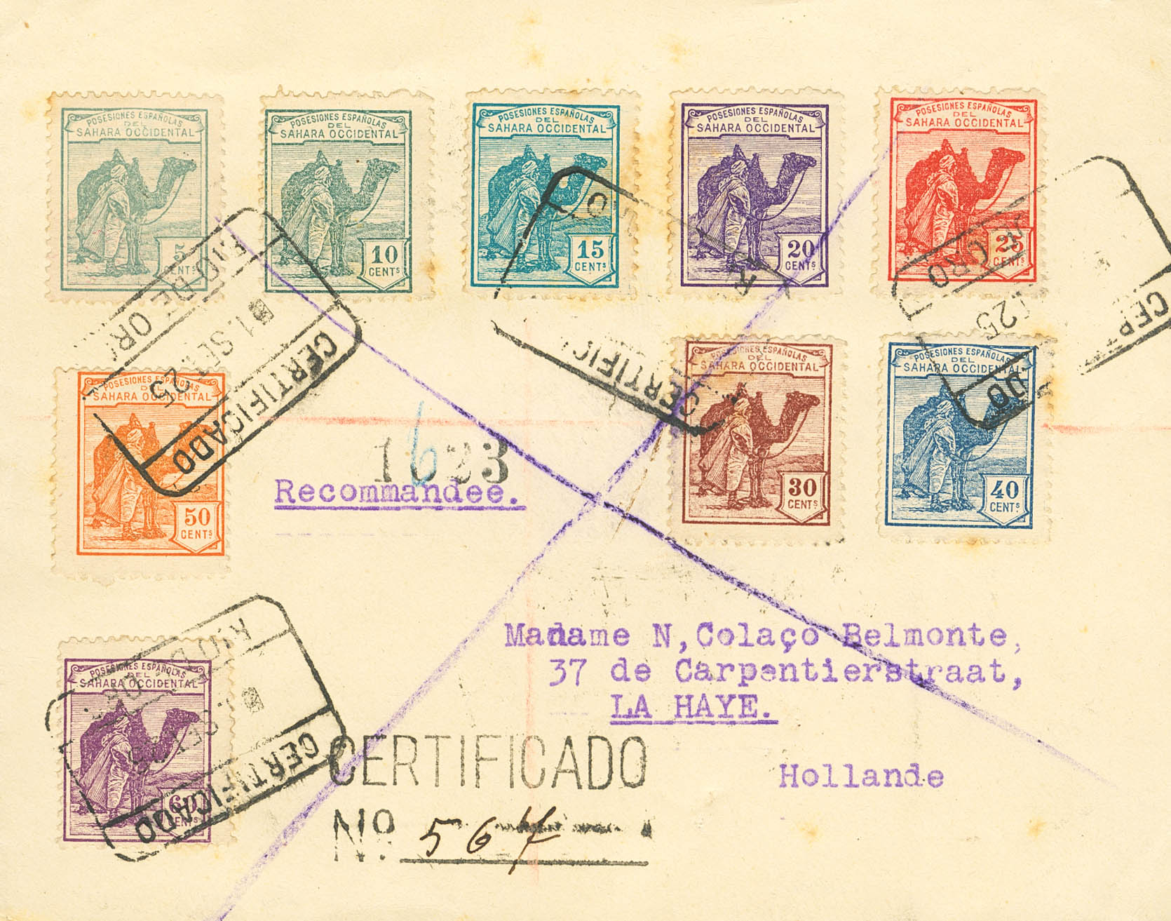 1/9. 1925. 5 cts a 60 cts (algún sello tonalizado). Certificado de RIO DE ORO a LA HAYA (PAISES BAJOS). Al dorso tránsito. BONITA Y MUY RARA.
