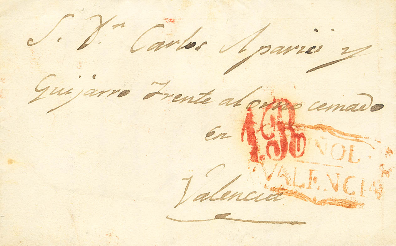 English 1851. BUÑOL to VALENCIA. Mark BUÑOL / VALENCIA, in red (PE3), 2004 edition. MAGNIFICENT AND VERY RARE.