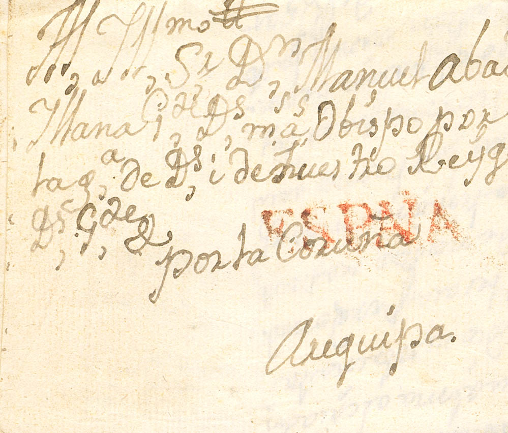 1778. PESQUERA DEL DUERO (VALLADOLID) to AREQUIPA (PERU). ESPAÑA brand, applied in transit through La Coruña (PE26) 2004 edition. MAGNIFICENT AND VERY RARE DESTINATION. Ex-Antonio Cuesta.