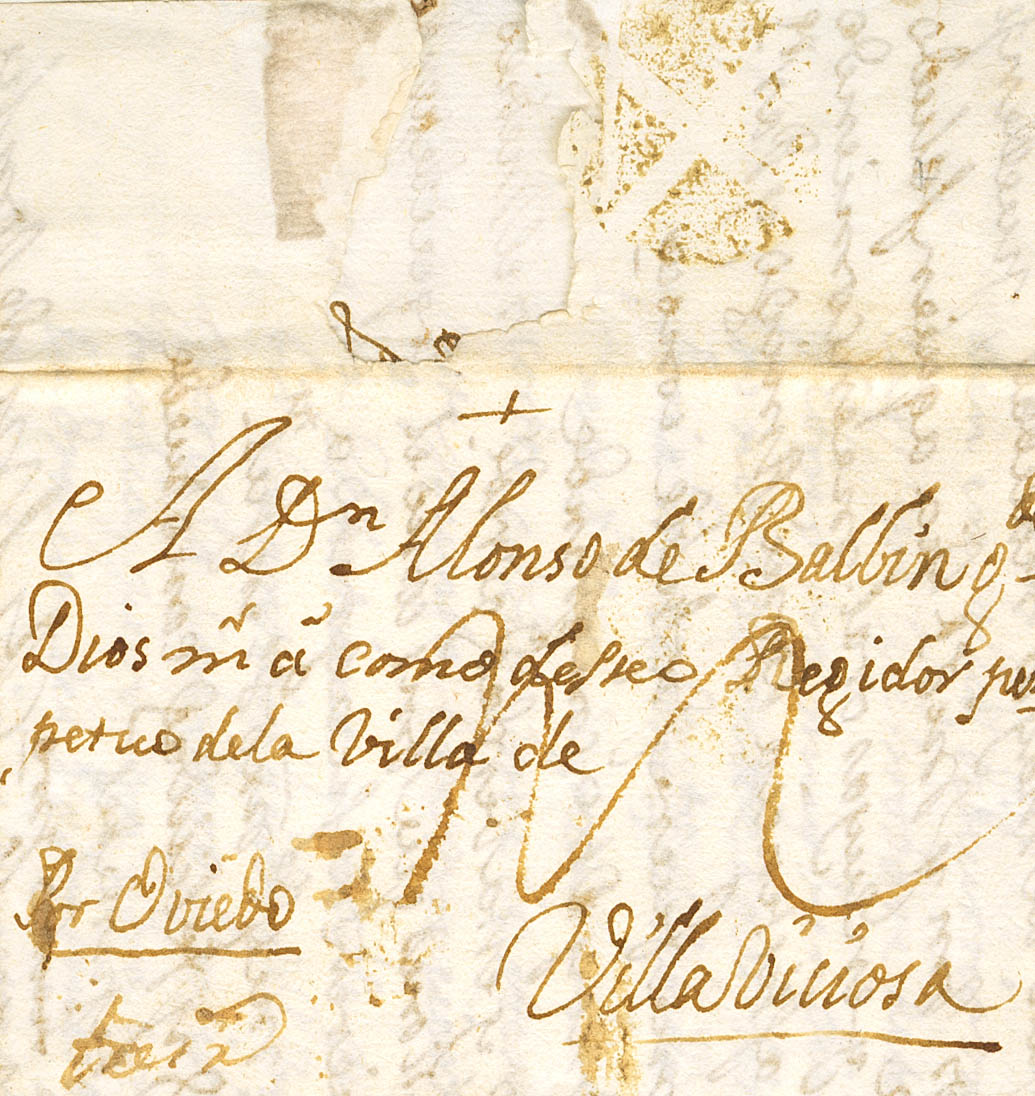 1724. ROME (ITALY) to VILLAVICIOSA (ASTURIAS). On the back there is a circular mark CROSS IN NEGATIVE, attributed to Madrid and most likely used by merchants to indicate their correspondence and postage. Handwritten rectified (PE110) 2004 edition. MAGNIFICENT AND VERY RARE, VERY FEW KNOWN ONES ADDRESSED TO ASTURIAS. Ex-Antonio Cuesta.