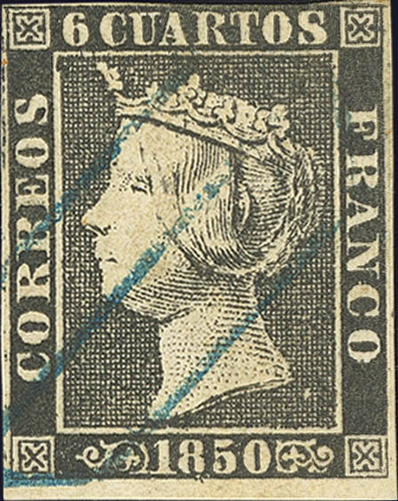 English 1. 1850. 6 black quarters (I-11). Postmark ATAUD DE JACA, in blue. MAGNIFICENT AND VERY RARE. Cert. GRAUS and COMEX.