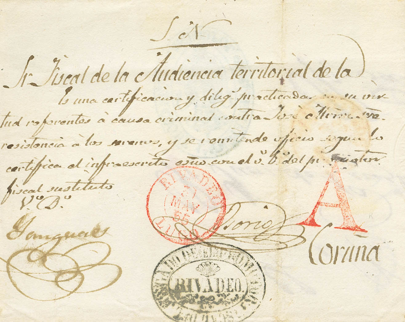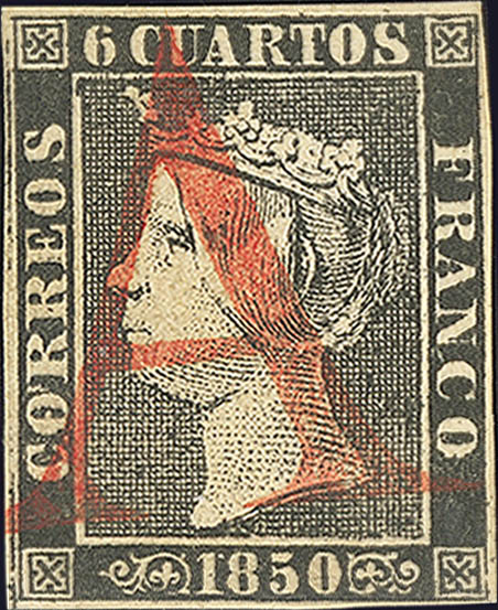 1. 1850. 6 black quarters (I-15). "A" postmark, red Rivadeo subscription. MAGNIFICENT AND VERY RARE, SPECTACULAR PRINTING. Cert. GRAUS. (a pre-philatelic letter is included for comparison of the mark).