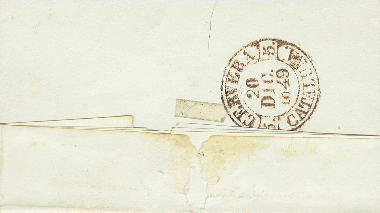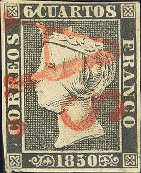 1. 1850. 6 black quarters (I-13). "As" postmark, red Tárrega subscription. MAGNIFICENT AND VERY RARE. COMEX certificate. (a pre-philatelic letter is included for comparison of the mark).