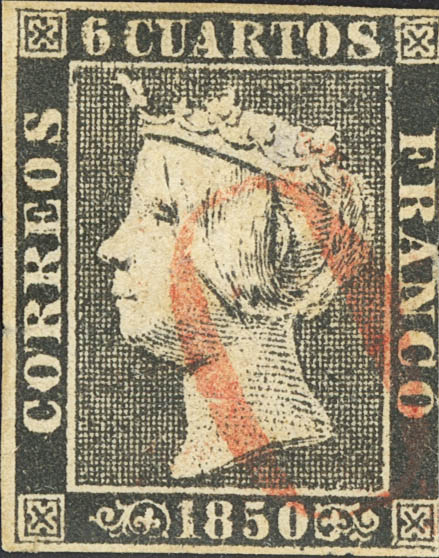 1. 1850. 6 black quarters (I-5). Cancellation "0", in red from Arévalo. MAGNIFICENT AND VERY RARE. Cert. GRAUS. (pre-philatelic front included for comparison of the mark).