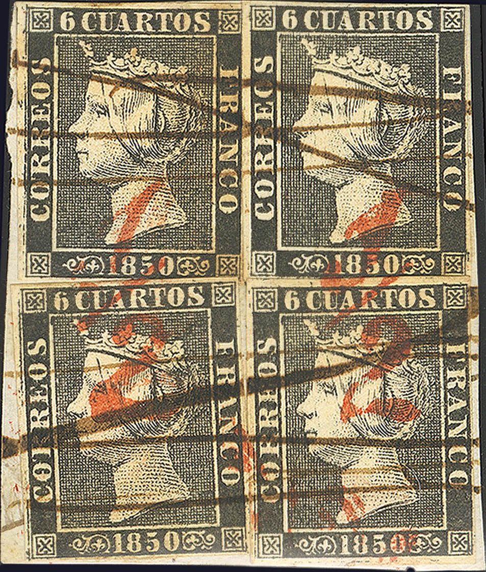 |fragment| 1(4). 1850. 6 black quarters, four stamps, on fragment. Postmark "½", red postage of unknown origin and INK LINES. MAGNIFICENT. Cert. CEM.