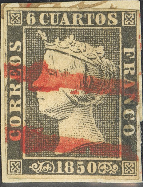 1. 1850. 6 black quarters (I-20) (unimportant repair). Postmark "11", in red from Villanueva de la Serena. MAGNIFICENT AND EXTRAORDINARILY RARE, WE ONLY HAVE EVIDENCE OF THE EXISTENCE OF ONE OTHER SIMILAR ONE. Cert. GRAUS.