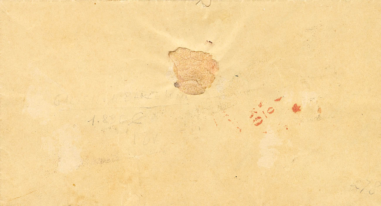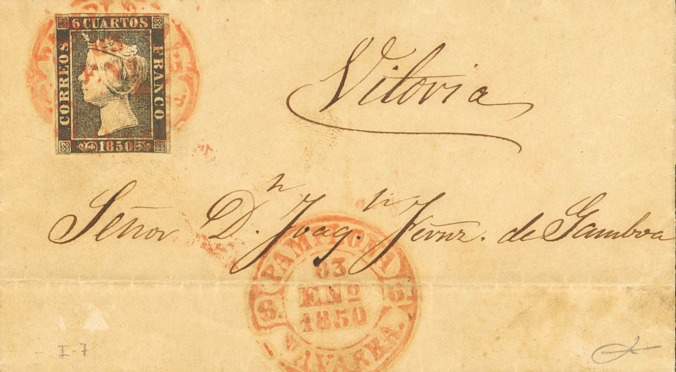 |ENVELOPE| 1. 1850. 6 black quarters. PAMPLONA (NAVARRA) to VITORIA (ALAVA). Postmark PAMPLONA / 03-JANº-1850 / NAVARRA, error on the day "03" instead of "30". MAGNIFICENT AND EXTRAORDINARY RARE, ESPECIALLY WITH THIS STAMPING, PIECE OF ENORMOUS SPECTACULARITY. Cert. COMEX.