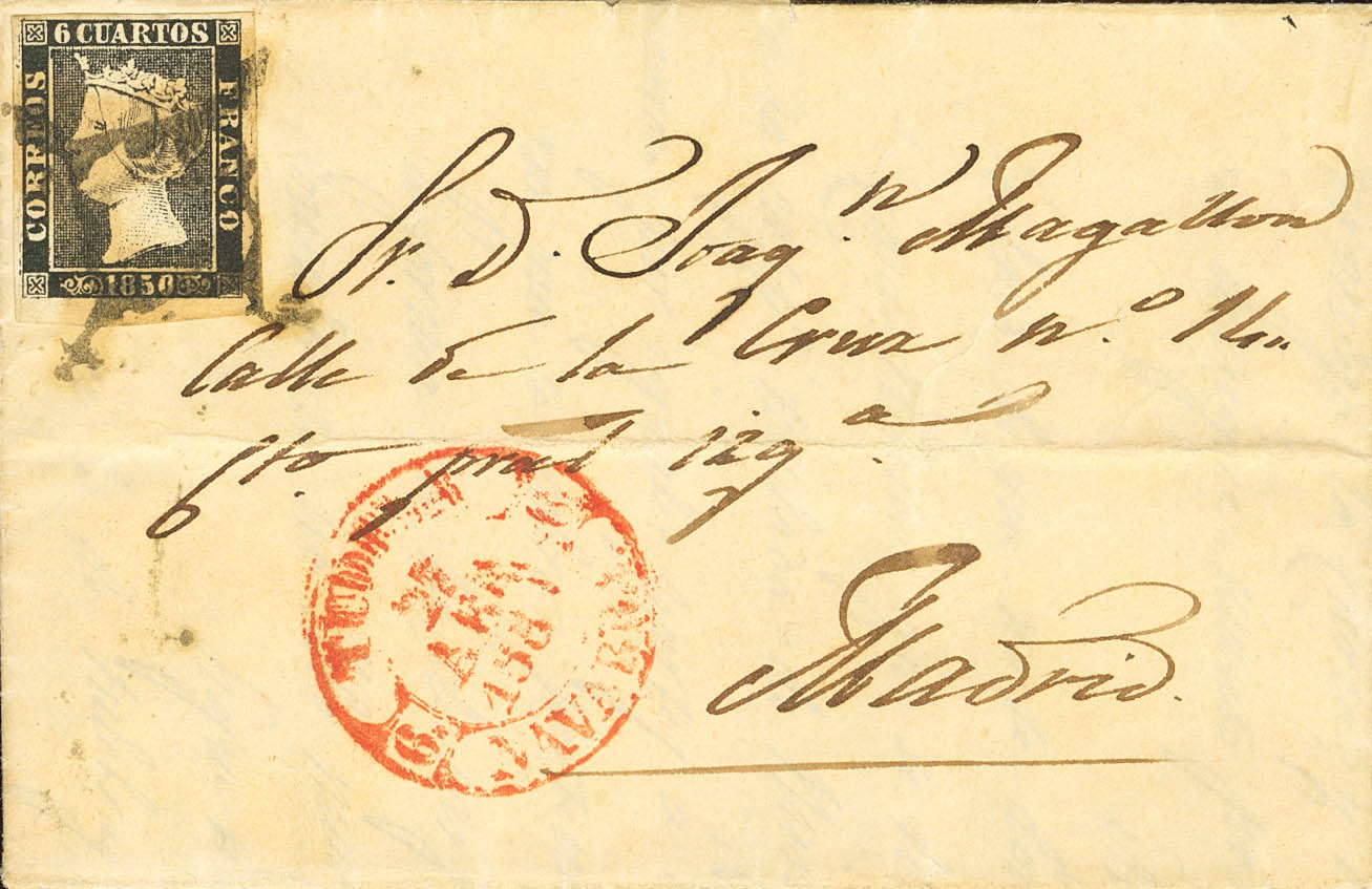 |ENVELOPE| 1. 1850. 6 black quarters (I-24), lower right corner of sheet. MONTEAGUDO (NAVARRA) to MADRID. On the front Baeza TUDELA / NAVARRA. MAGNIFICENT AND VERY RARE.