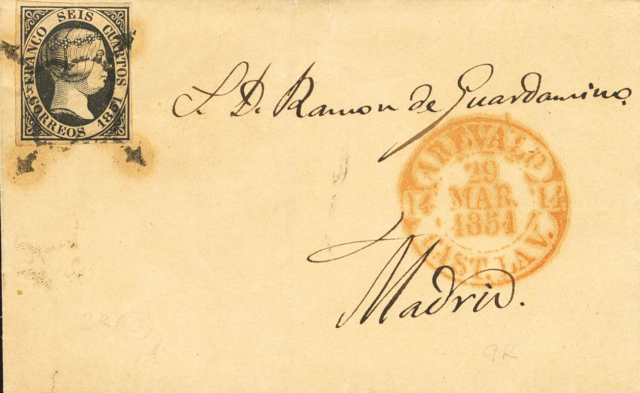 6. 1851. 6 black quarters. AREVALO (AVILA) to MADRID. MAGNIFICENT.