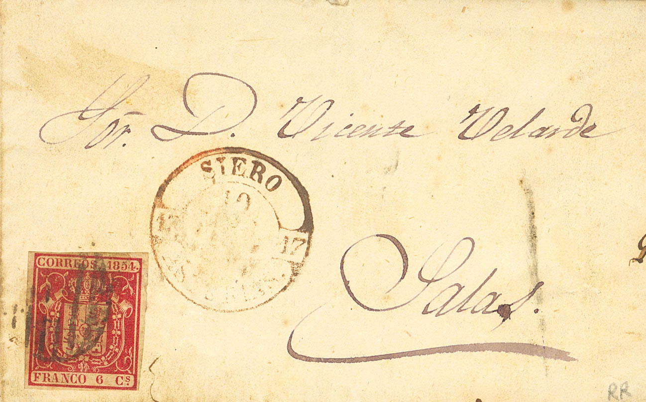 English 24. 1854. 6 red quarters. SIERO (ASTURIAS) to SALAS (ASTURIAS). MAGNIFICENT AND VERY RARE.