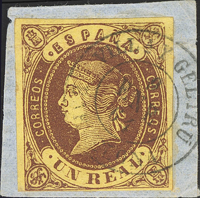 |fragment| 61. 1864. 1 real chestnut, on fragment. Postmark VILLA Y GELTRU / 9-JAN-64 / BAGoodELONA. MAGNIFICENT AND VERY RARE DUE TO ITS USE OUTSIDE THE CIGoodULATION PERIOD, SPECTACULAR PRINTING.