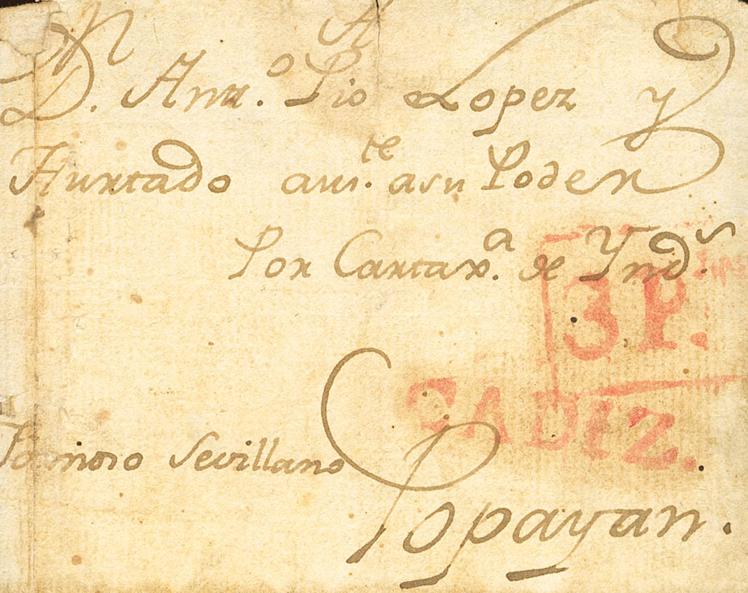 1789. CADIZ to POPAYAN (COLOMBIA). Mark CADIZ, in red (PE13) 2004 edition. MAGNIFICENT AND RARE, PROBABLY THE ONLY KNOWN ONE ADDRESSED TO POPAYAN FROM CADIZ IN THIS PERIOD. Ex-Antonio Cuesta.