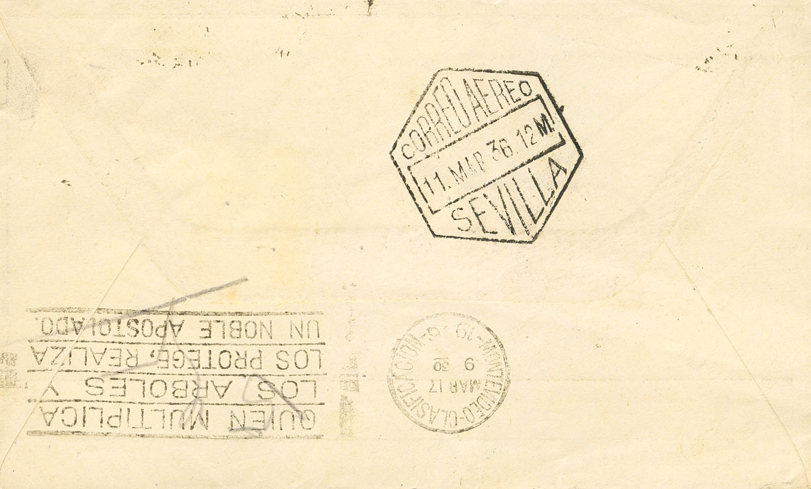689(2), 685, 687. 1936. 2 pts azul, dos sellos, 25 cts y 30 cts. MADRID a MONTEVIDEO (URUGUAY). Al dorso llegada. MAGNIFICA.