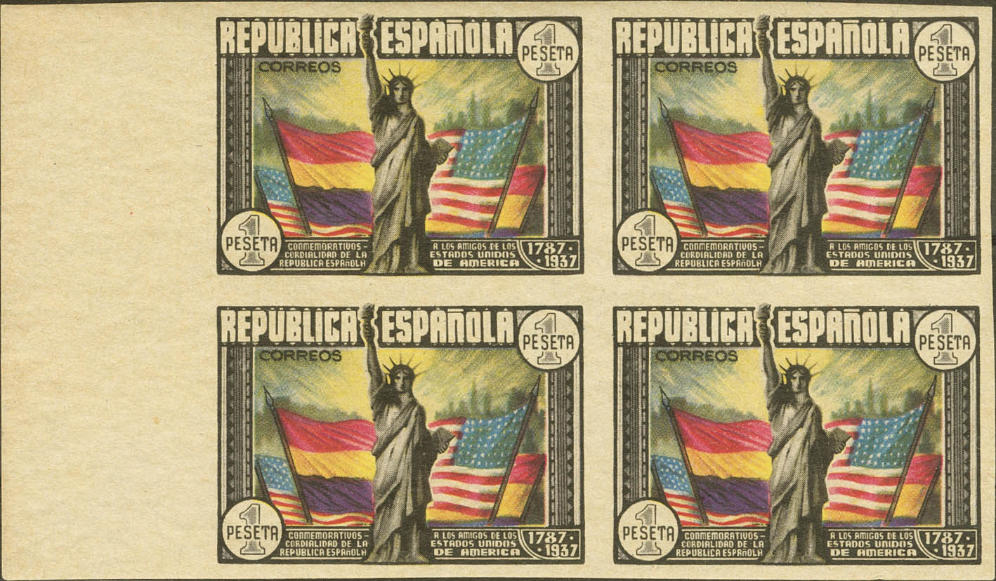 ★★/★ 763as(4). 1938. 1 pts multicolor FONDO GRIS NEGRO, bloque de cuatro, esquina de pliego (tres sellos con fijasellos). SIN DENTAR. MAGNIFICO Y RARO. Edifil 2020: +337 Euros
