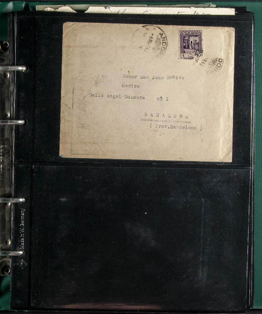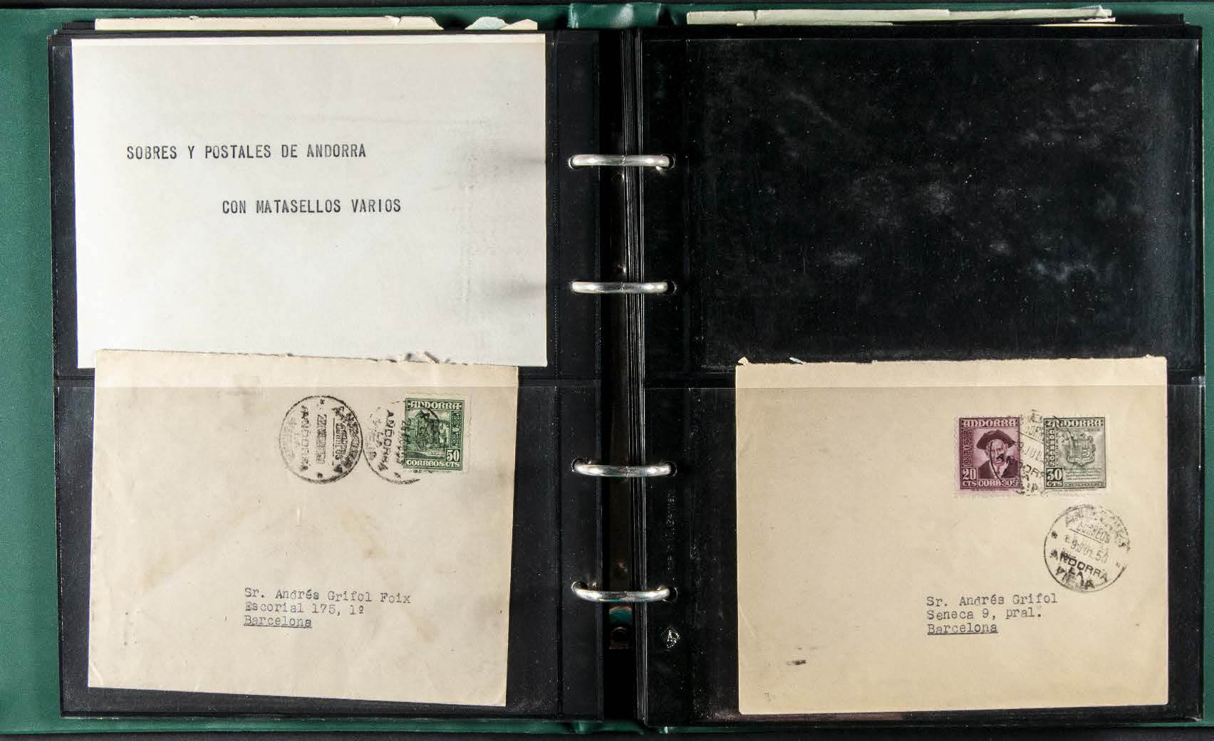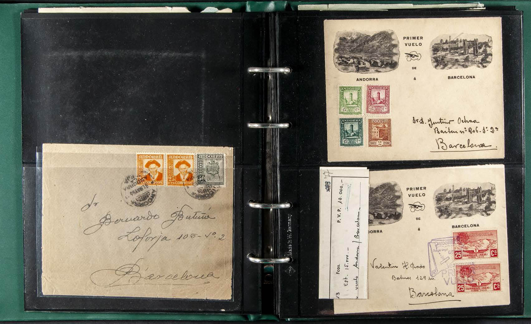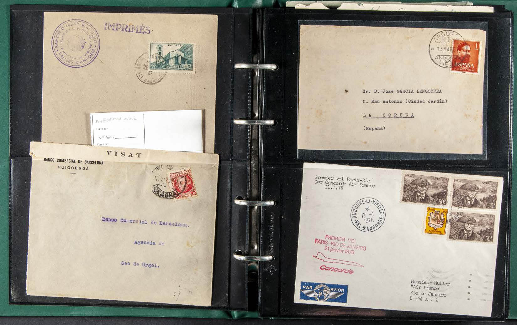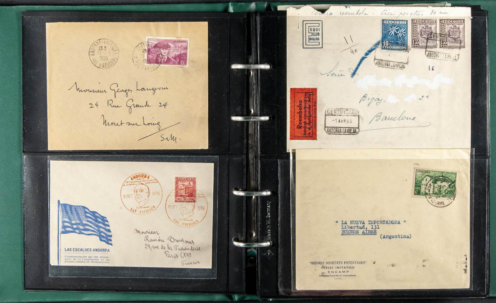 English (1920ca). Very interesting collection of hundreds of postcards (circulated blank) and letters from Spanish and French Andorra between 1920 and 2001, including numerous photographs, tickets, maps, tourist brochures, business cards and other collectibles, all related to Andorra, as well as special postmarks and stamps from Spain used in Andorra. MUST BE EXAMINED.