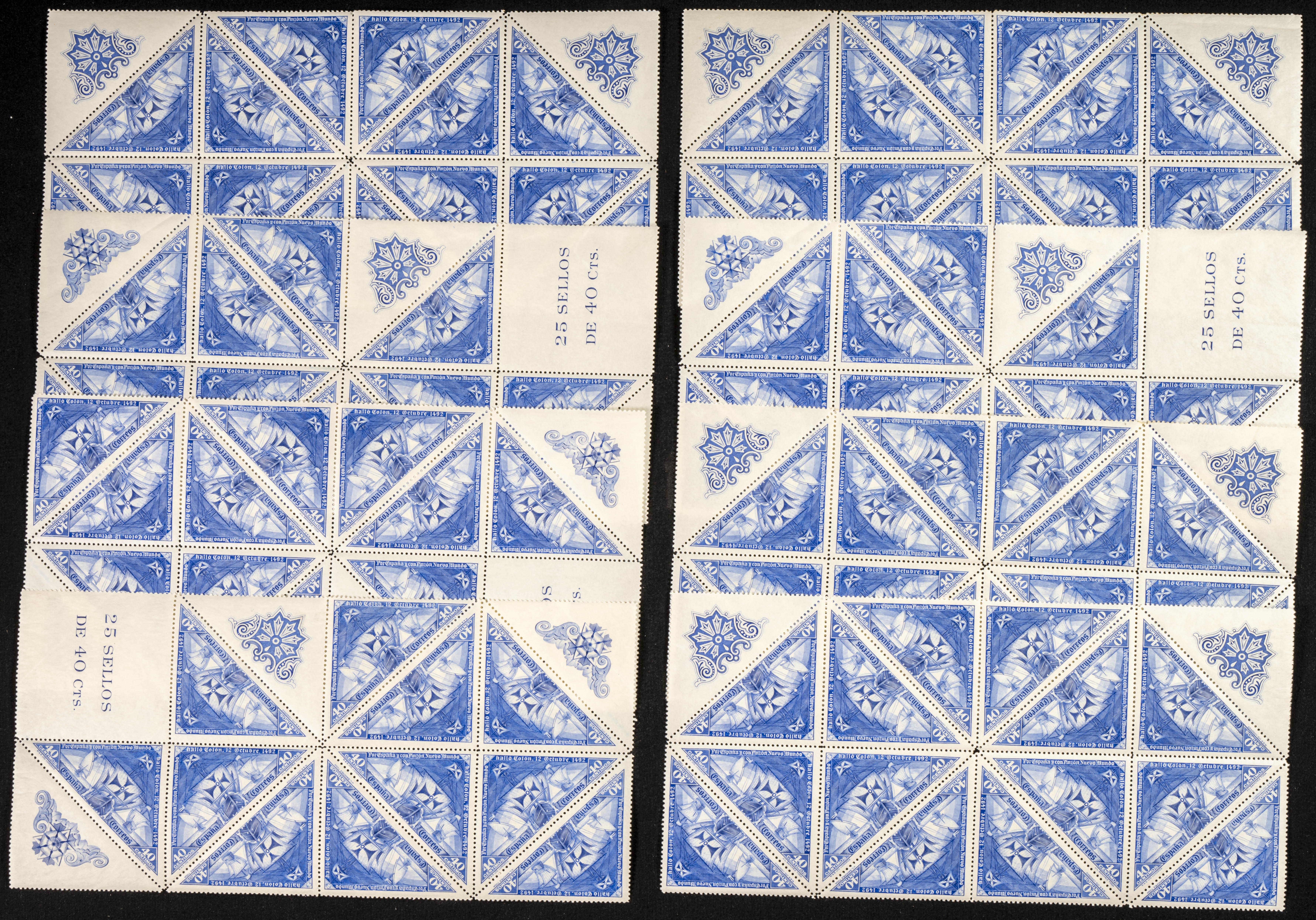 ★★ 541(100). 1930. 40 cts overseas, one hundred stamps in blocks, some with decorations. DIUncirculatedOVERY OF AMERICA. TO BE EXAMINED. Edifil 2025: 1,600 Euros
