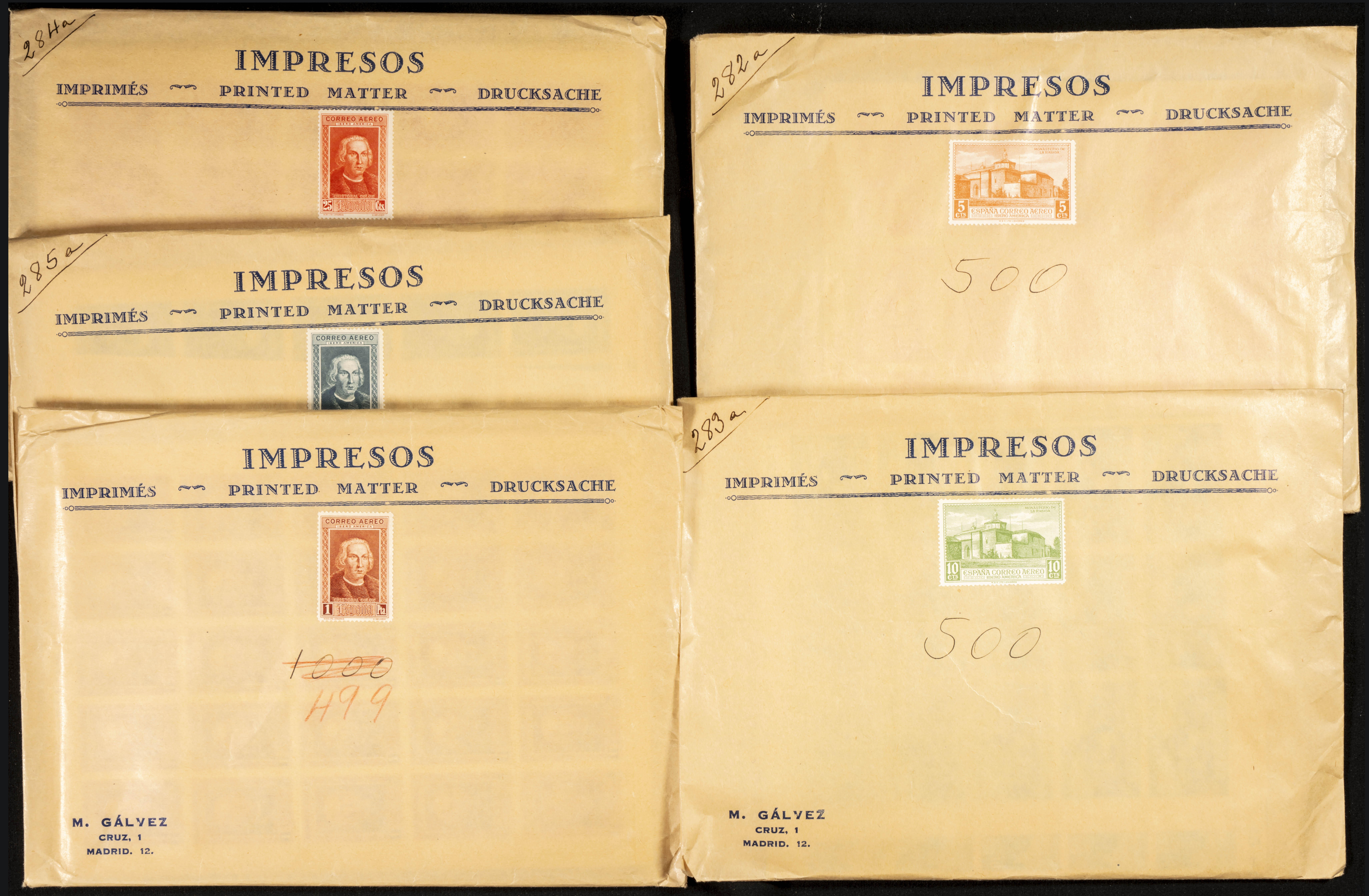 ★★ 559/63(500). 1930. 5 cts orange, 10 cts green, 25 cts red, 50 cts grey and 1 pts brown, five hundred stamps of each value in sheets. TO BE EXAMINED. Edifil 2025: 5,600 Euros
