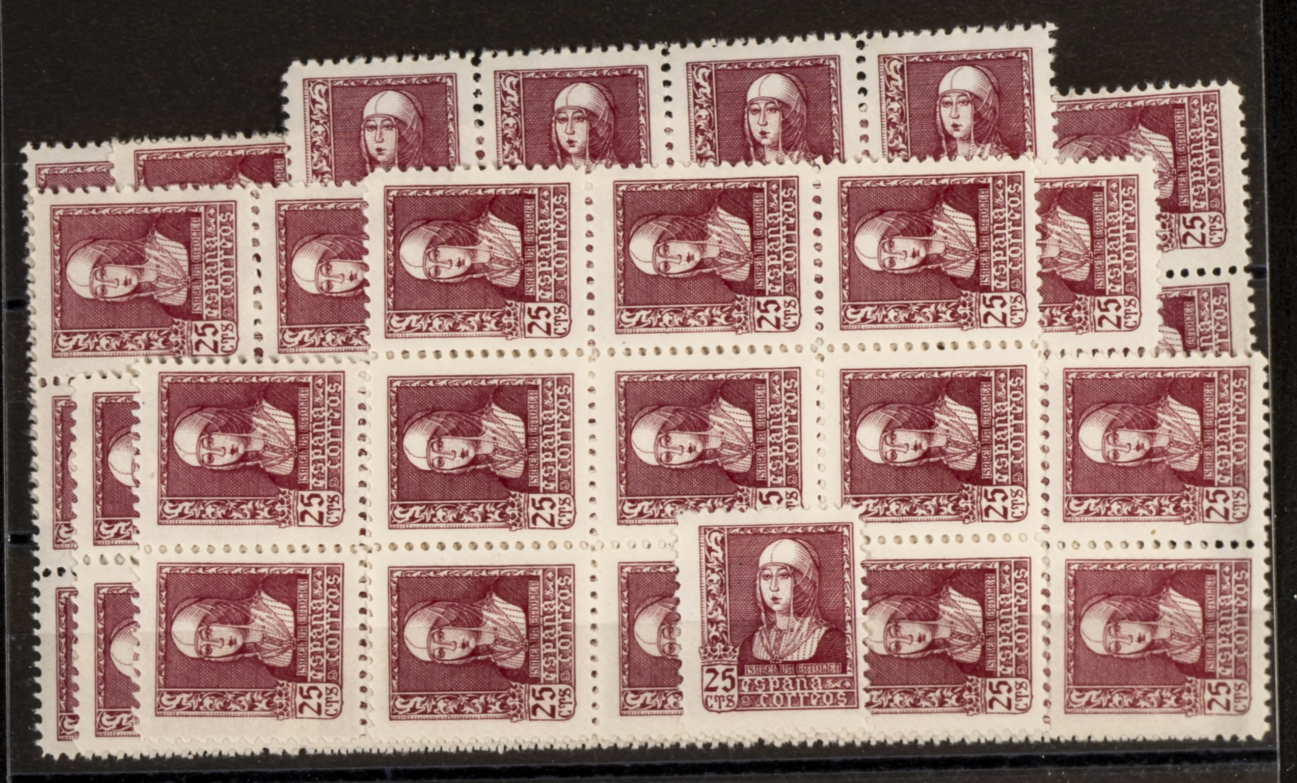 ★★ 856(69). 1938. 25 cts carmine, sixty-nine stamps. ISABEL (good quality in general). TO BE EXAMINED. Edifil 2025: 1,380 Euros