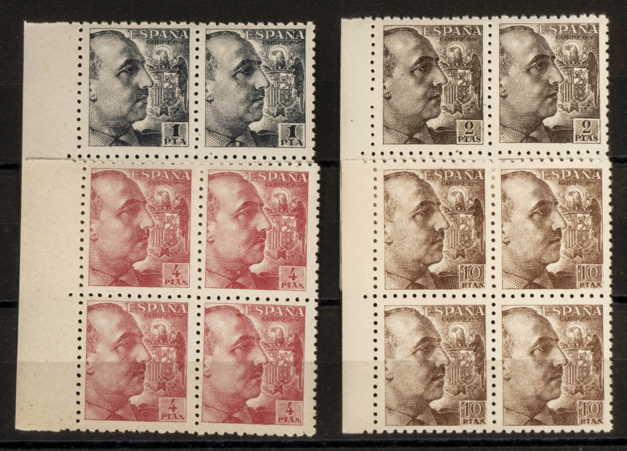 ★★ 930(4), 932/33(4), 935(4). 1940. 1 pts black, 2 pts brown, 4 pts pink and 10 pts brown, in blocks of four. FRANCO (good quality overall). TO BE EXAMINED. Edifil 2025: 328 Euros
